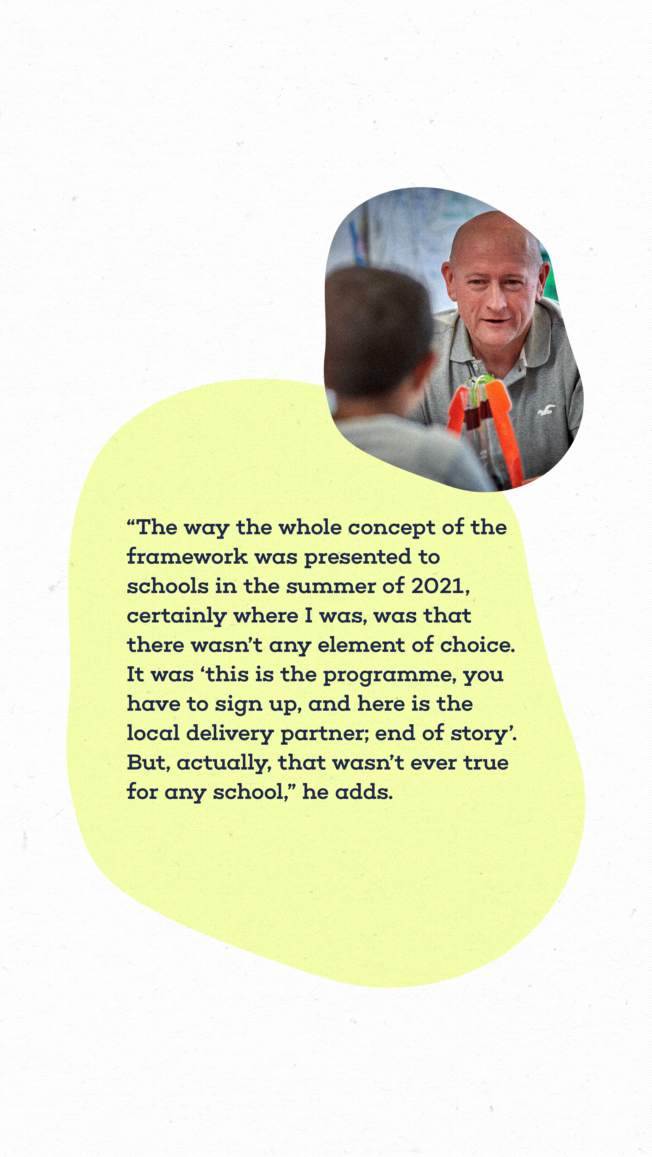 “We said the DfE needed to reduce the workload involved with the framework. It needed to stop the providers from setting evening and weekend work. We said things needed to be more flexible and that it was proving difficult to roll out given all the other pressures schools are under. We also called for the framework to be more about supporting teachers than forcing them to follow a curriculum and this notion of fidelity,” Ian explains.